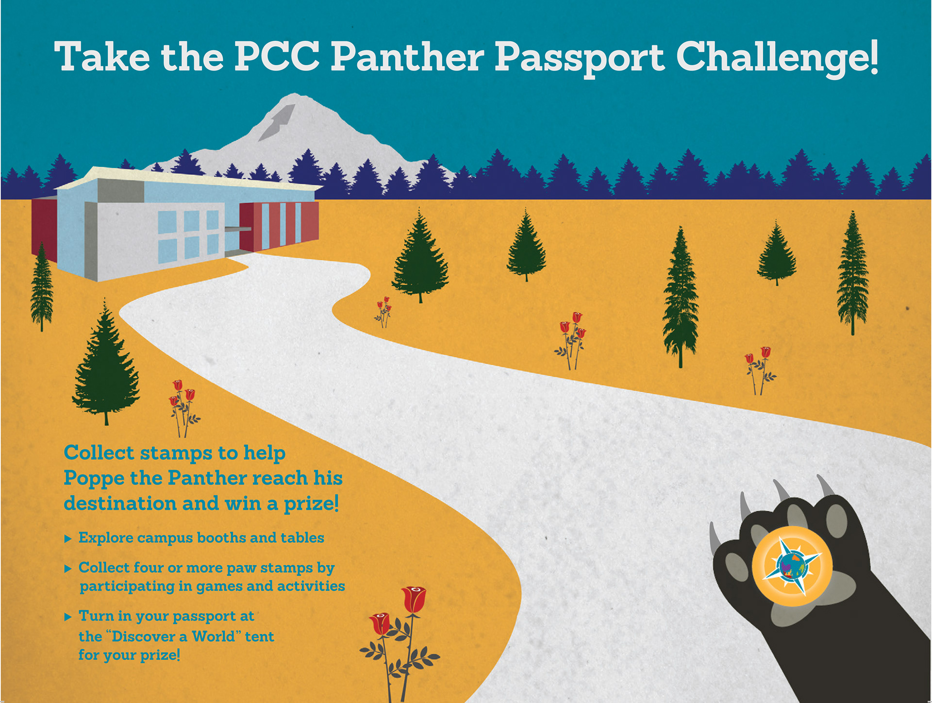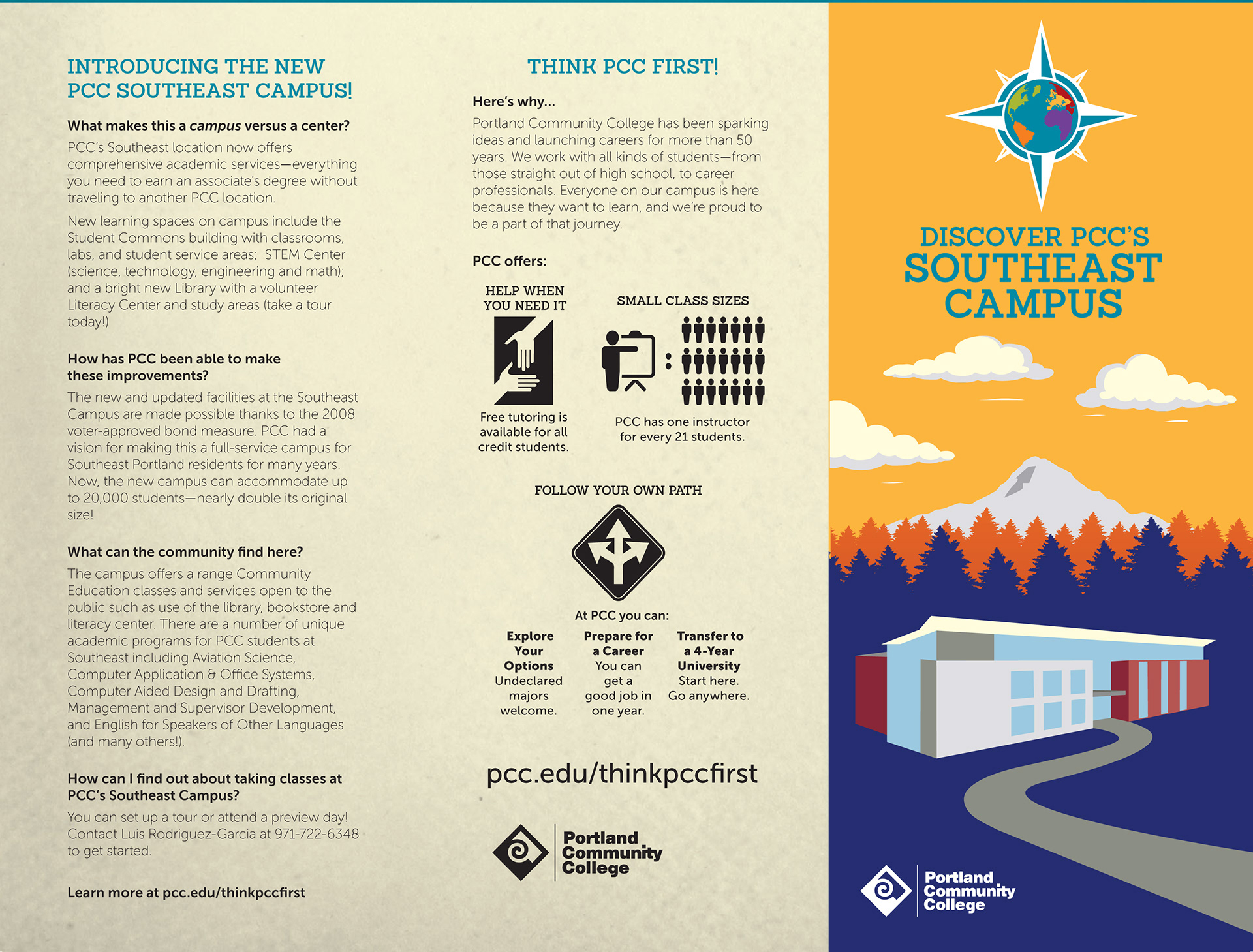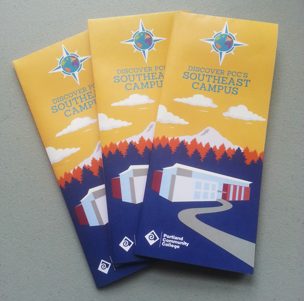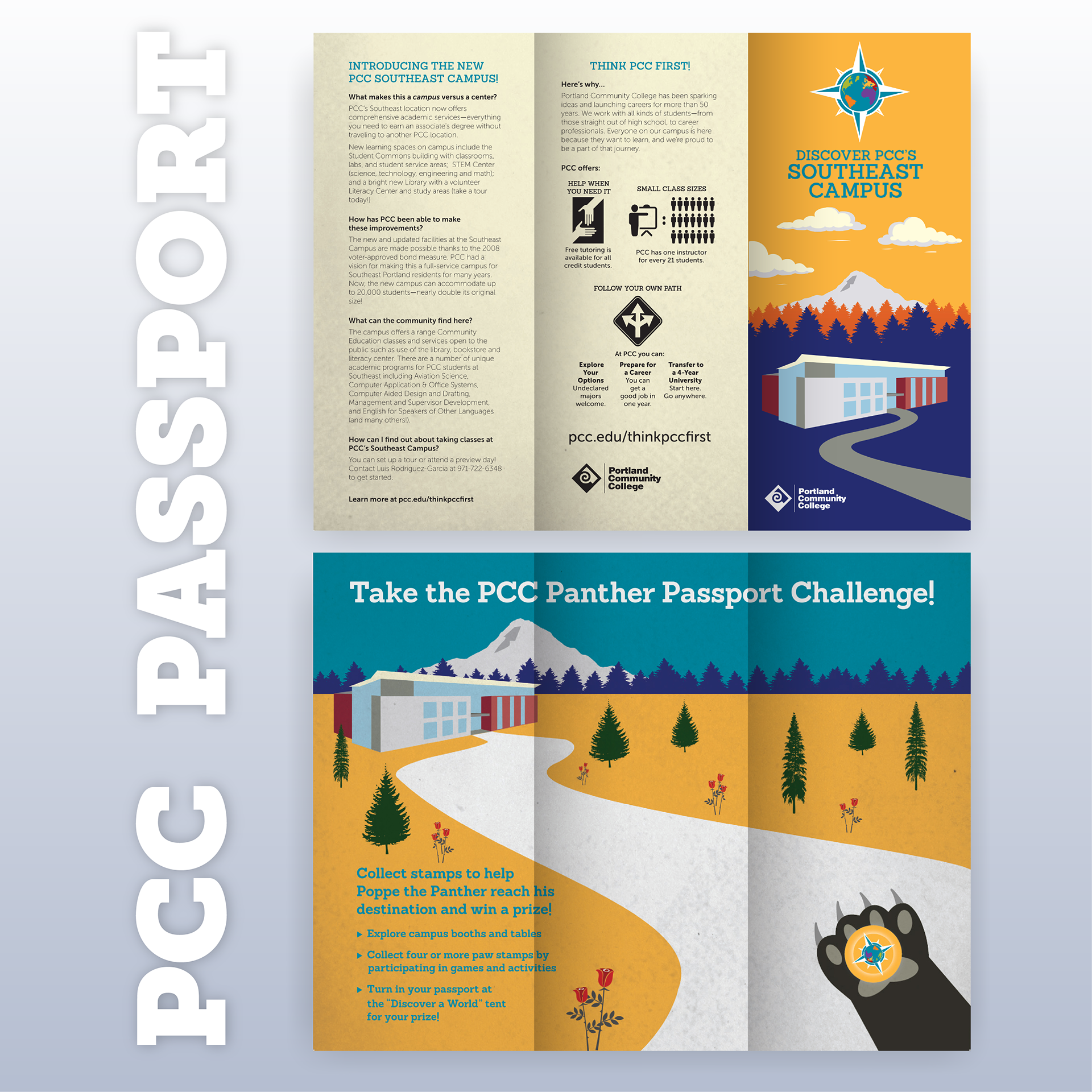 A document with FAQs and information was needed for the grand opening of PCC's new campus. These brochures were made to inform and act as a map, prompting visitors to get stamps along the way while discovering the new campus.
